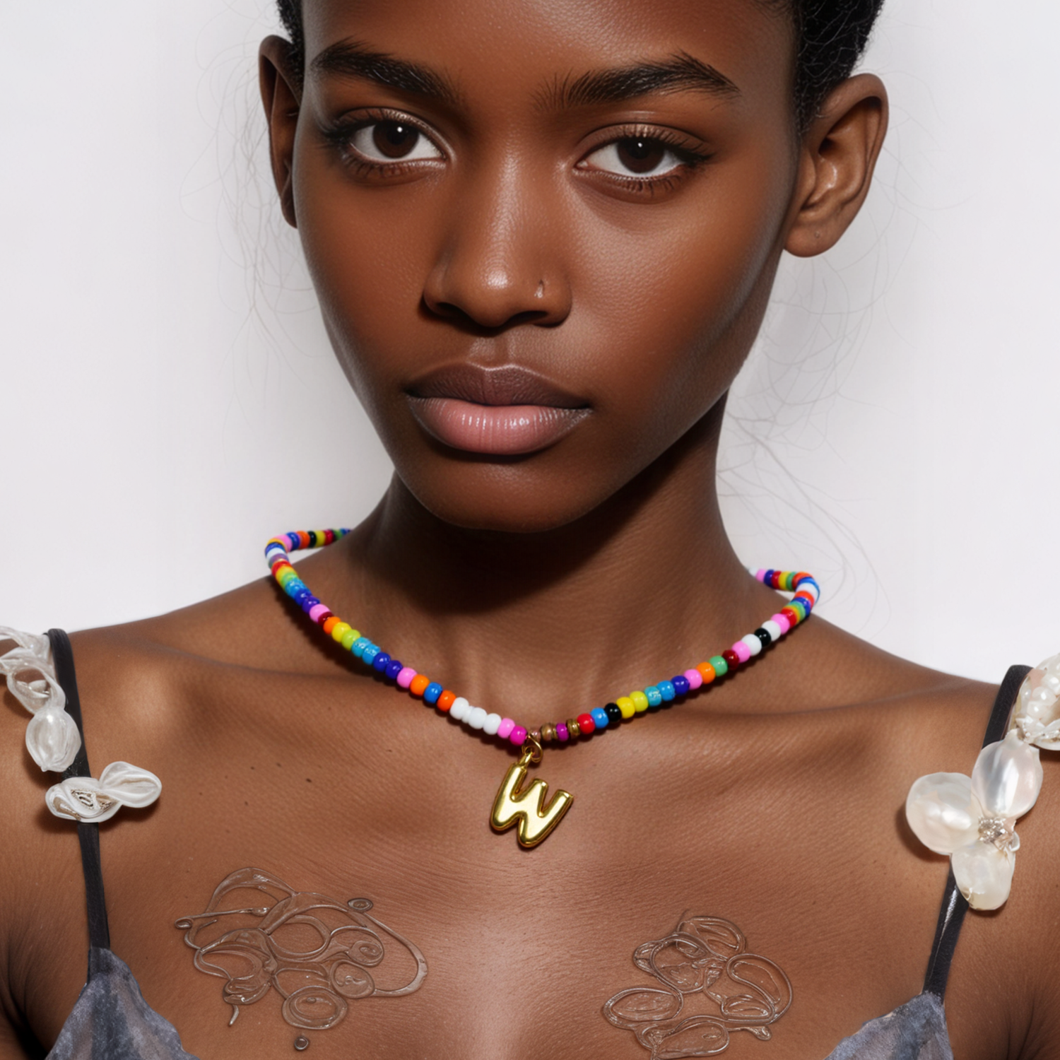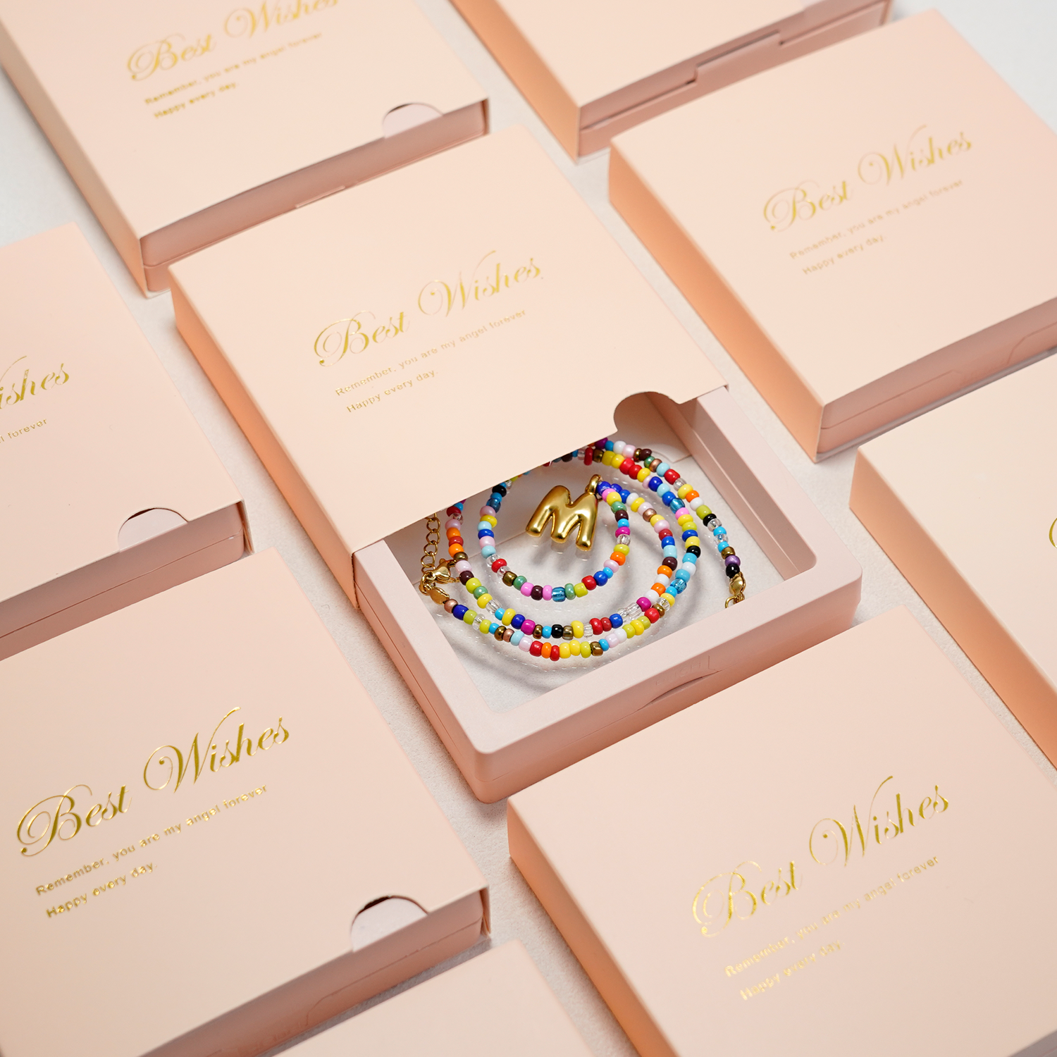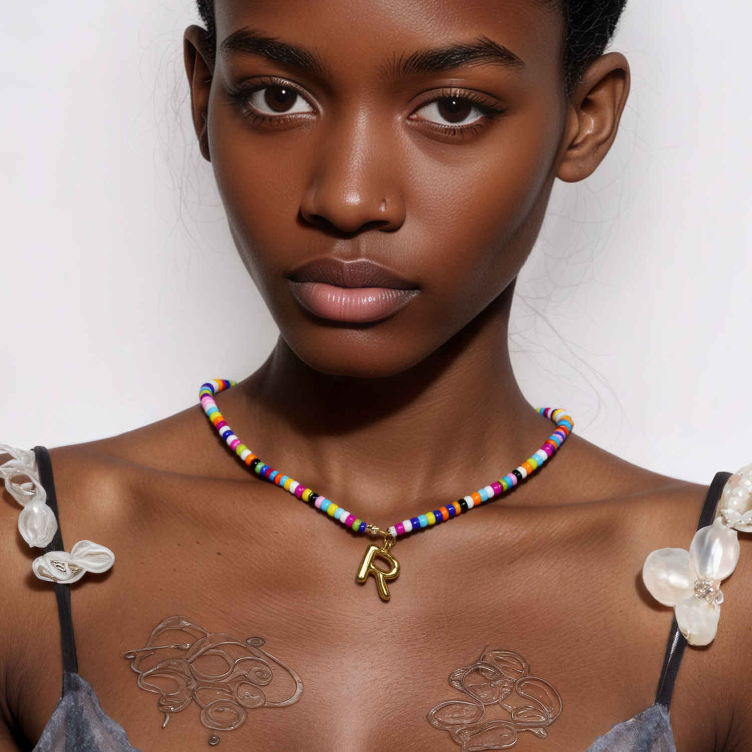 Each necklace is lovingly handmade with colorful plastic rice beads and a gold-plated letter charm. No two are exactly the same—just like you.